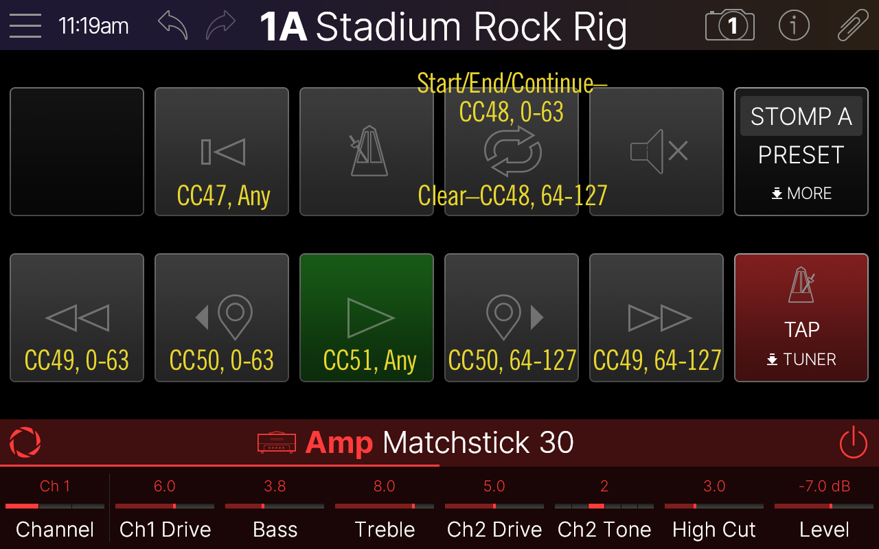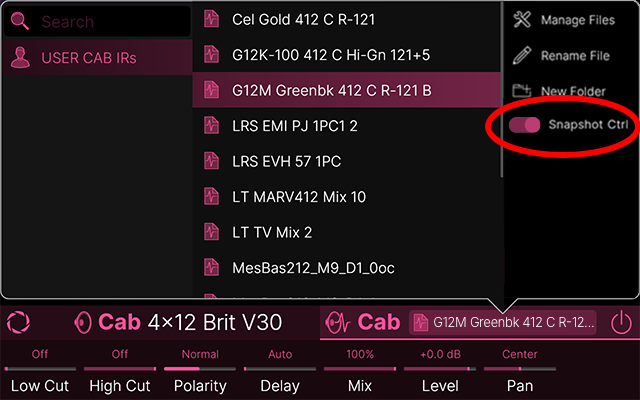 Helix/HXと同様に、Stadiumでは異なるCab IRをスナップショットごとに呼び出せるようになりました。Cab IRファイルブラウザから、サイドバーの「Snapshot Ctrl」をタップします。
