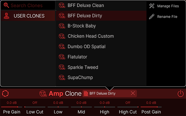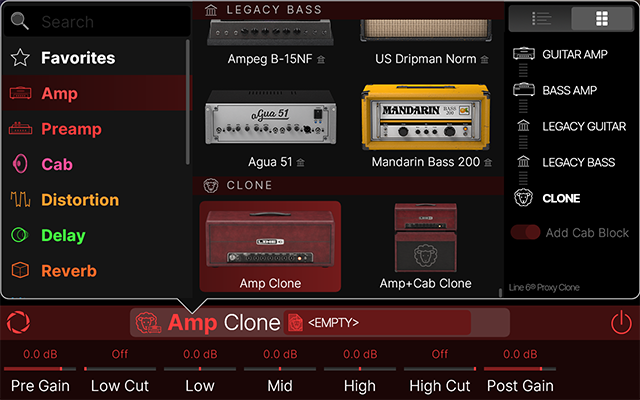 各クローンタイプはそれぞれのモデル・カテゴリに表示されます。(Amp+CabのクローンはAmpカテゴリに表示されます)Model Listから適切なカテゴリ(Amp、Preamp、またはDistortion)を選択し、サイドバーのCloneをタップするとリストの一番下まで素早くスクロールできます。クローンをタップして選択してください。