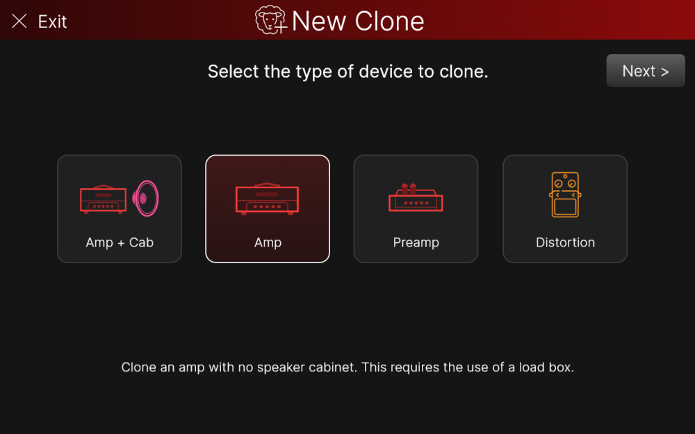 アンプ、プリアンプ、またはペダルをHelix Stadiumに接続するには、接続手順に忠実に従い、「Next >」をタップしてください。それぞれのクローンタイプごとに異なる接続手順が指示され、Helix Stadium XLとHelix Stadiumの間でも接続が多少異なることにご注意ください。(左から右:Amp+Cab、Amp、Preamp、Distortion)