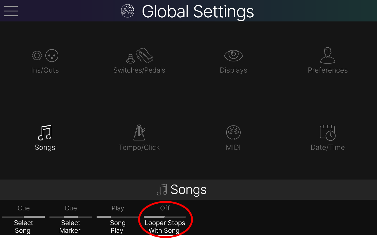 Global Settings > Songs > Looper Stops With Song