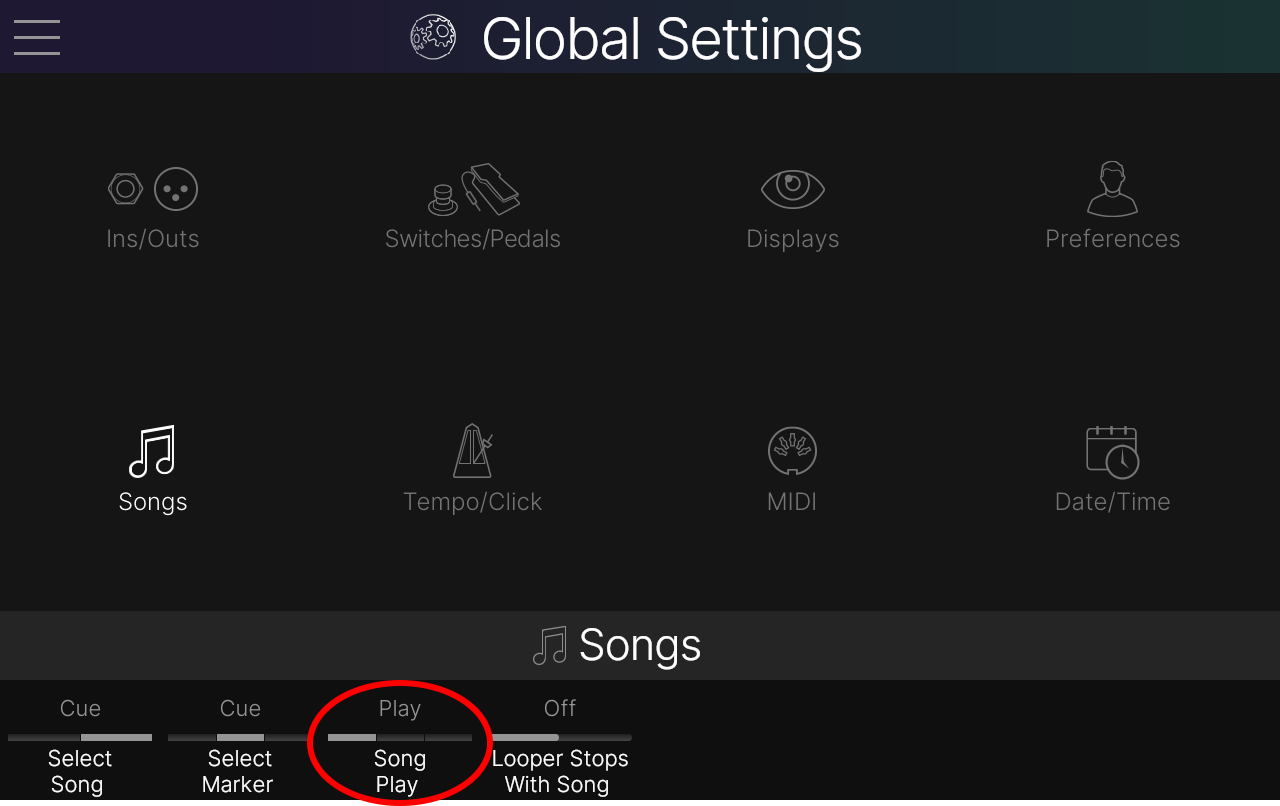 新しいグローバル設定により、キューが設定された曲を再生する際に何が起こるかの挙動を決定することができます。これには、再生ボタンを押す、Transport > Play スイッチを踏む、FS12(再生)スイッチを押す、Transportパネルの再生アイコンをタップする、またはバージョン1.3では Helix Stadium にSong Selectメッセージを送信する(CC0、値 0-127、上記のプレイリストおよび曲のMIDIリコールを参照)が含まれます。これにより、再生を開始せずに曲を選択できるようになりました。