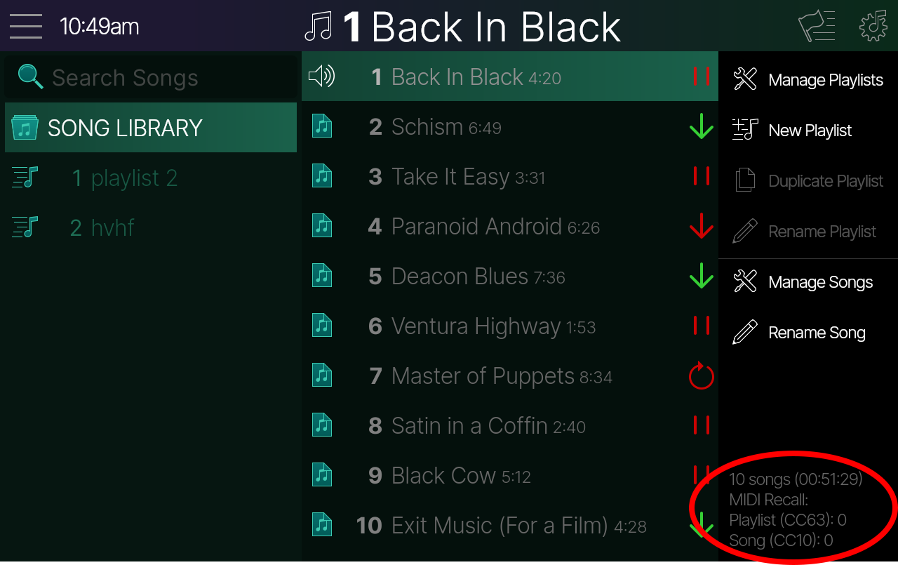 ソング・ビューから、曲名をタップしてソング・リストを開きます。サイドバーには、現在のプレイリストと曲を呼び出すために使用されるMIDI CCメッセージが表示されます: