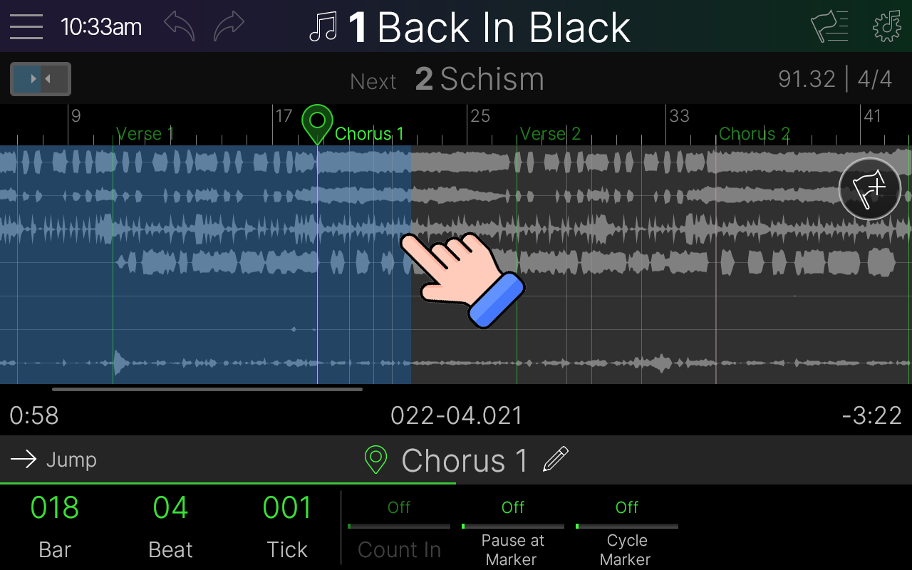 - Songビューから「Add Flag」をタップし、MIDIフラグを曲のタイムライン上の配置したい位置へドラッグします。ノブ1〜3(Bar、Beat、Tick)を回して位置を微調整します。